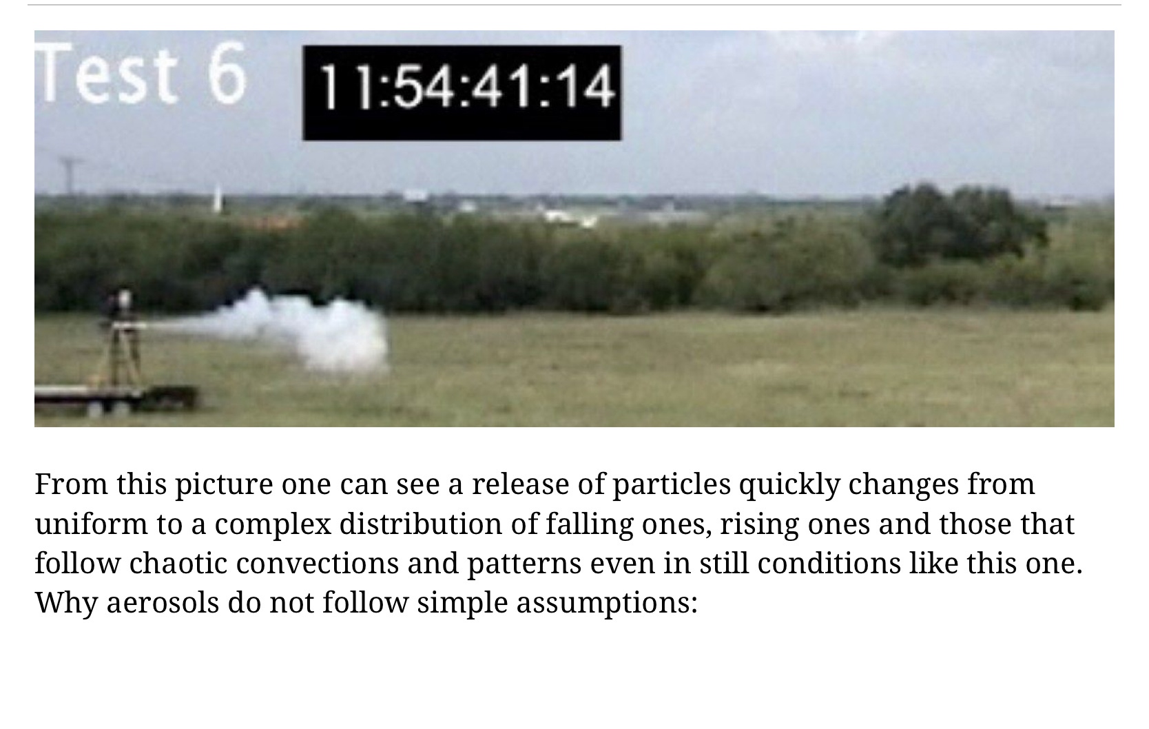 From this picture one can see a release of particles quickly changes from uniform to a complex distribution of falling ones, rising ones and those that follow chaotic convections and patterns even in still conditions like this one. Why aerosols do not follow simple assumptions:
