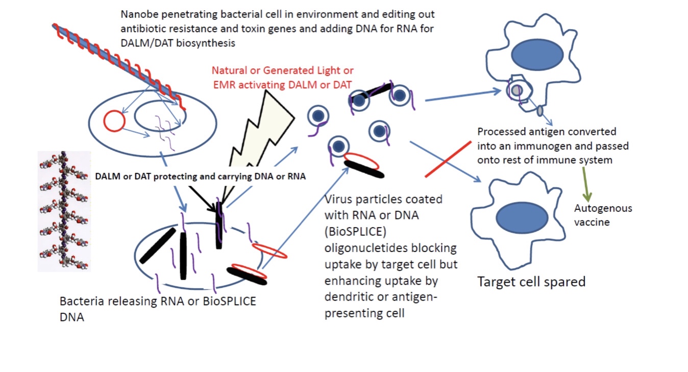 One application: Nanobe technology integrated with CRISPR to genetically neutralize bacterial or viral pathogenic genetic elements, latter if bacterial cell replaced with viral host cellA composite diagram of antibacterial, antiviral, and vaccine-enhancing activity of the biotechnology