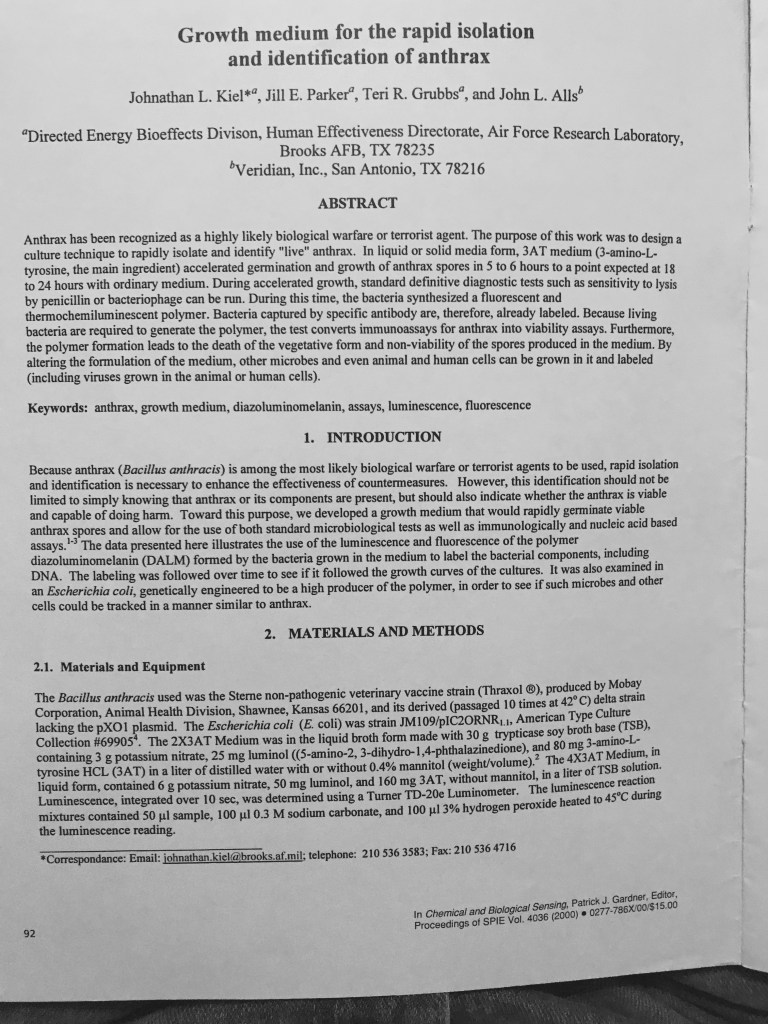 The Nanobe gene transfer in bacteria and potential horizontal RNA transient transfer by transfected animal or human cells to naive cells; Kiel, J.L., Tijerina, A., Holwitt, E.A., Sloan, M.A., Woitaske, M., and Fan, M. Compositions, Methods and Uses for Biosynthetic Plasmid Integrated Capture Elements; US Patent.: US8,628,955B2, Jan.14,2014.What Kennedy fears but we have only seen in bacteria, not in animal or human cells. This is worrisome enough, but even in bacteria, the transferability was only for three iterations after which it ended.Nanobe transformed Bacillus anthracis (outlined in red) BaSOAJ7, on secure deposit at American Type Culture Collection (ATCC), which was destroyed
